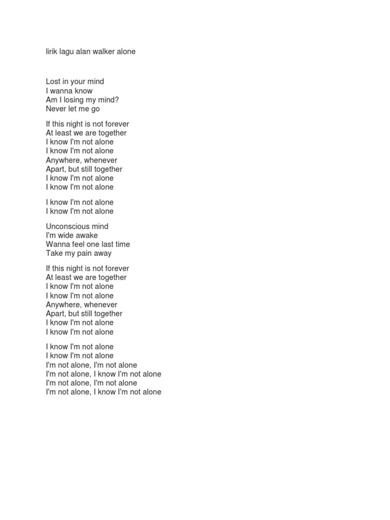 Download 8 Lirik Lagu Alone Alan Walker Terupdate. Never let me go if this night is not forever at least we are together i know i'm not alone i know i'm not alone anywhere, whenever apart, but still together i know i'm not alone i know i'm not alone Lirik terjemahan alone oleh alan walker. Gunnar greve, alan olav walker, noonie bao, jesper borgen, anders froen when alan was asked to describe alone in three words for people who haven't heard the song yet, his answer was melancholic, emotional and mysterious. for me this song is about cohesion. Walkers, it's finally time to reveal the trailer for 'alone pt. Koleksi lengkap lirik lagu alan walker hanya ada di lirikbagus